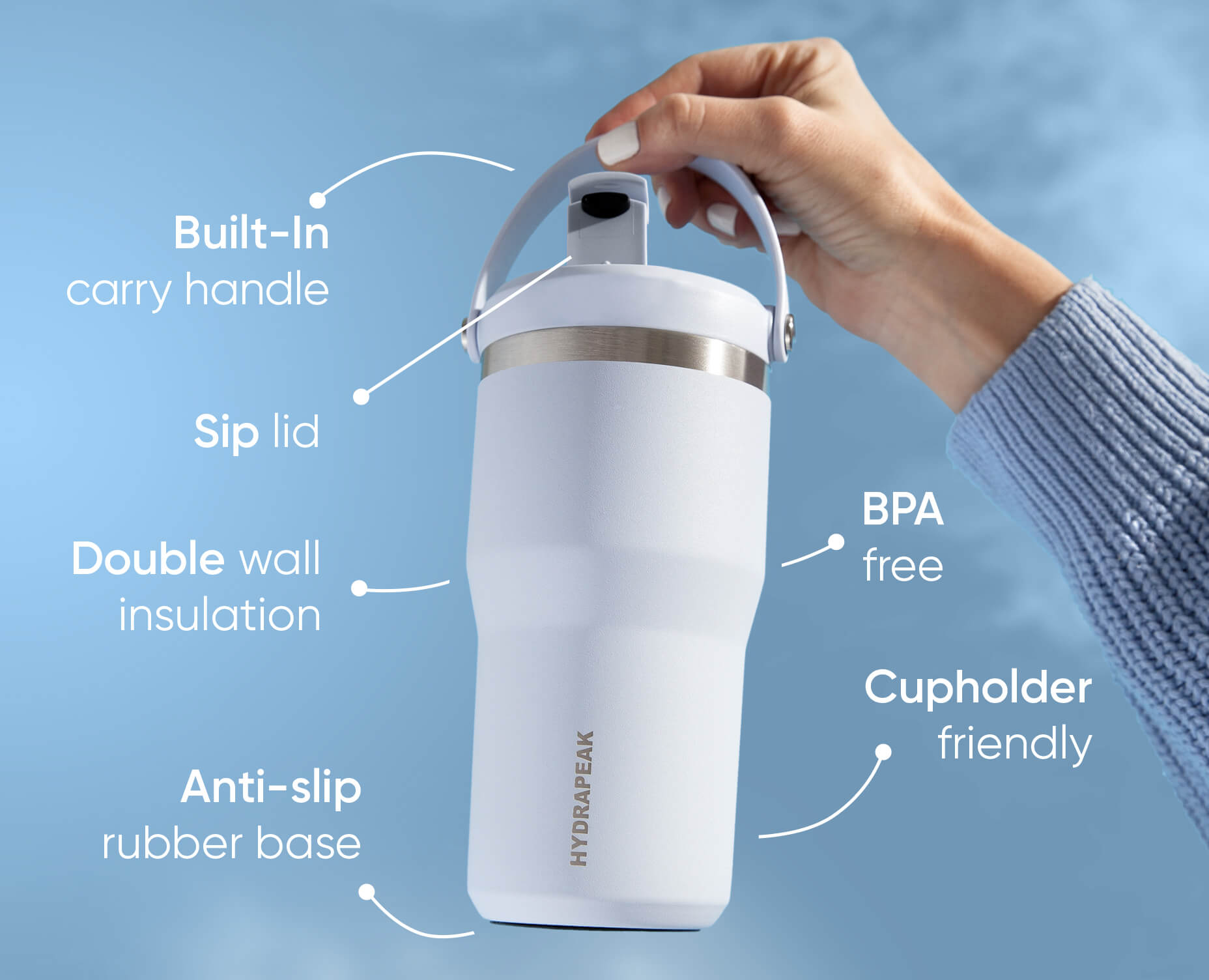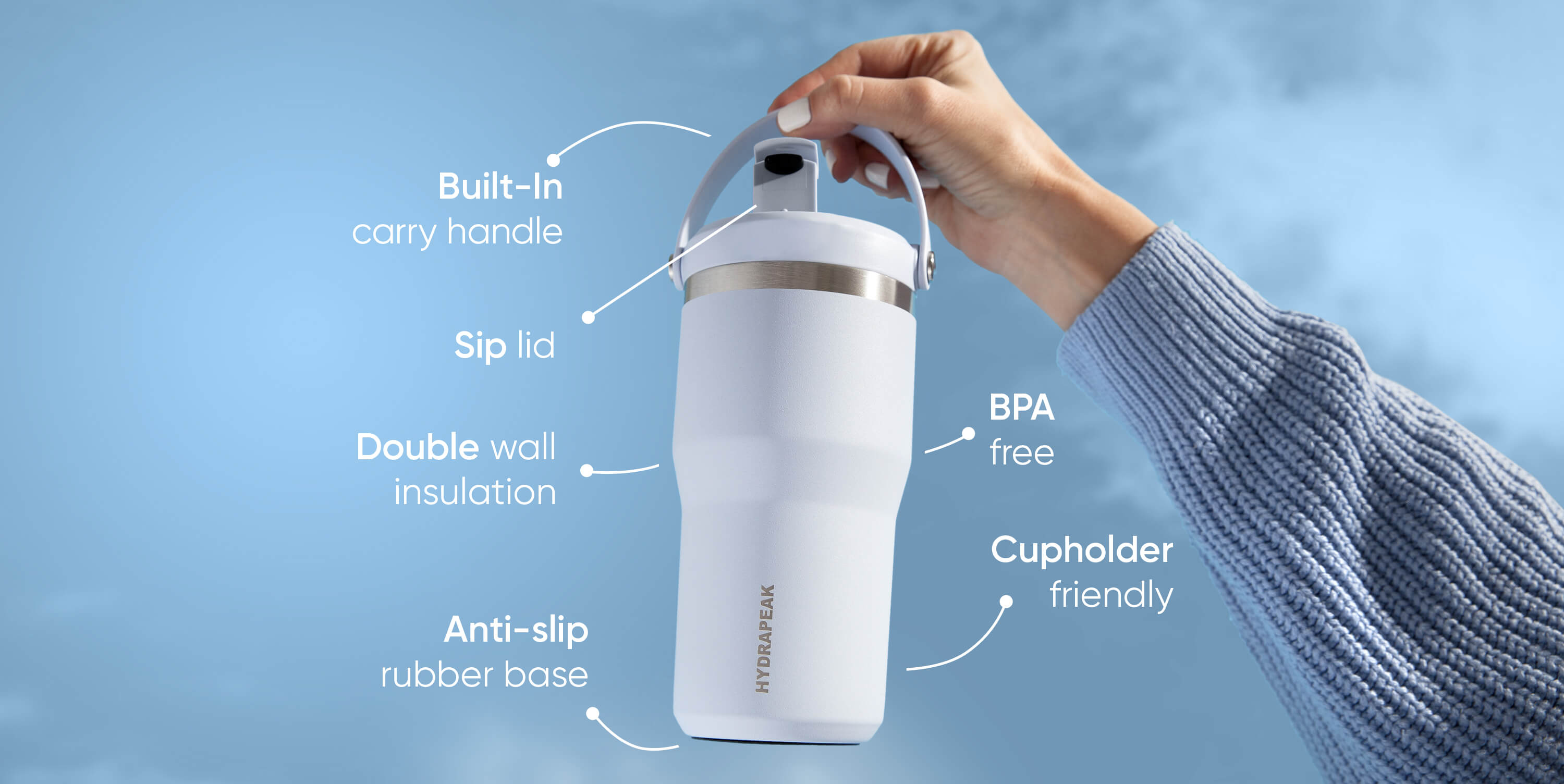 The Nomad tumbler with Sip Lid and Handle features Hydrapeak's triple layer, double wall vacuum insulation technology, keeping your drinks at the perfect temperature, all day long. Cold for up to 24 hours, and hot for up to 12 hours.